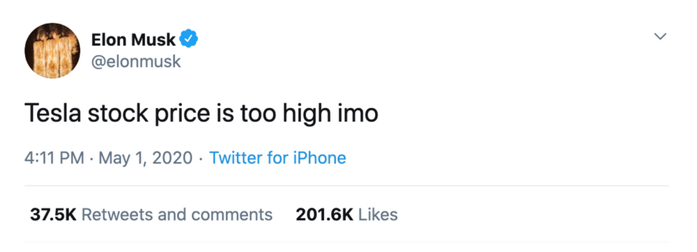 Tesla stock price is too high imo, musk tweeted on may 1.